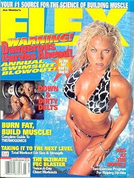 Flex Magazine considers themselves the bible of hardcore bodybuilding. Each month, Flex visits and speaks with the champions of bodybuilding at their gyms, at contests, and at their homes, gathering information and photographs, Flex brings you their latest strategies, and the competitive goals that they apply to further develop their title-winning physiques. Flex is the official magazine of the IFBB Bodybuilding Federation. On the cover is Monica Brant. In the inset is Melvin Anthony and Garrett Downing. |