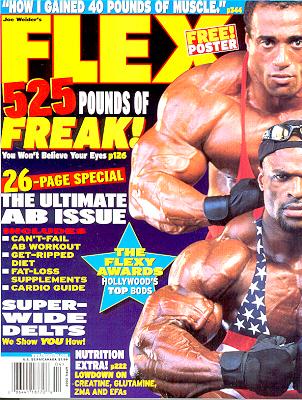Flex Magazine considers themselves the bible of hardcore bodybuilding. Each month, Flex visits and speaks with the champions of bodybuilding at their gyms, at contests, and at their homes, gathering information and photographs, Flex brings you their latest strategies, and the competitive goals that they apply to further develop their title-winning physiques. On the cover is Dennis James and Ronnie Coleman. | ![]() |