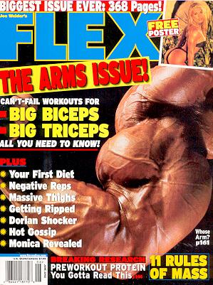 Flex Magazine considers themselves the bible of hardcore bodybuilding. Each month, Flex visits and speaks with the champions of bodybuilding at their gyms, at contests, and at their homes, gathering information and photographs, Flex brings you their latest strategies, and the competitive goals that they apply to further develop their title-winning physiques. On the cover is Lee Priest's arms. In the inset is Lisa Dulovic. | ![]() |