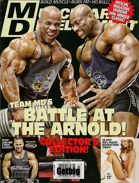 ![]() Muscular Development is another serious bodybuilder magazine that concentrates on hardcore bodybuilding, but also covers fitness and health related items. They pride themselves on giving its readers extensive coverage on the cutting edge of training, diet and nutrition articles. It also has great pictures of bodybuilders, and makes for enjoyable reading. On the cover is Victor Martinez and Dexter Jackson. In the insets are Mike Liberatore and Timea Majorova. |