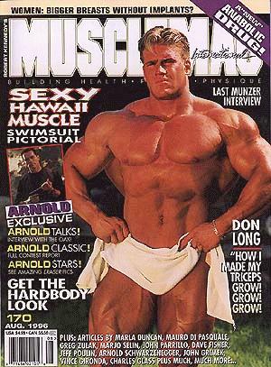 The August 1996 Musclemag International issue features interviews with Andreas Munzer (days before his death), and Arnold Schwarzenegger. Also, articles on how to build triceps by Don Long, the Ironman Contest pictorial, and how to get Breasts (for Women). The cover features Jay Cutler.