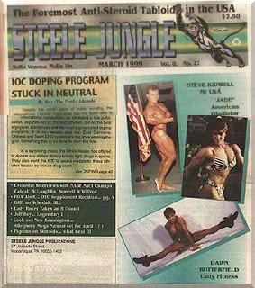 Steele Jungle Publications is a quarterly newspaper dedicated to bodybuilding, powerlifting and exercise. Our emphasis is on natural conditioning; our philosophy to enhance public knowledge and awareness on the dangerous side effects of anabolic steroids, androgens and growth hormones. On the cover is Steve Kidwell, Jade, and Dawn Butterfield.