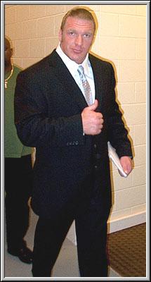 Triple H, in a suit, commentating.