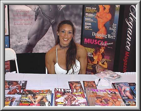 Denise Masino was at the Muscle Elegance booth, promoting her 10th magazine issue, and her latest videos. Denise currently plans to compete in the 2001 Ms. International. In talking about her magazine, Denise said that it has been a long, hard, and heavily invested venture into making it work, starting from the first black and white issue, which was basically a glorified catalog featuring Denise. The fans wanted more, with more people, and the magazine was born. Currently, the magazine seeks a balance between fitness and female bodybuilders in their pictorials.